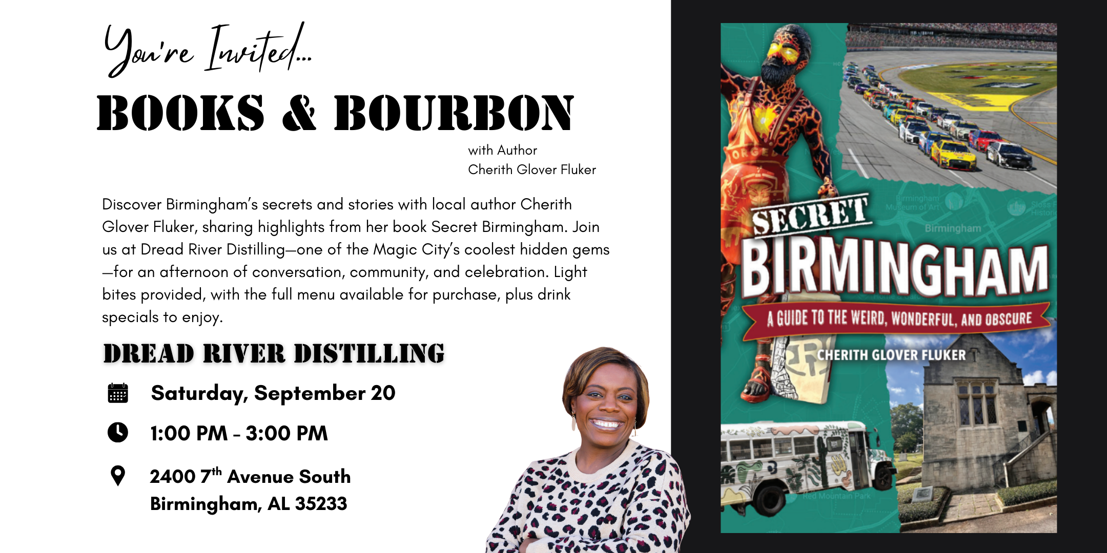 Join local author, Cherith Glover Fluker, on September 20, 2025, from 1:00 PM to 3:00 PM for an afternoon of stories, sips, and Southern charm at Dread River Distilling Co. as we celebrate the release of Secret Birmingham: A Guide to the Weird, Wonderful, and Obscure.